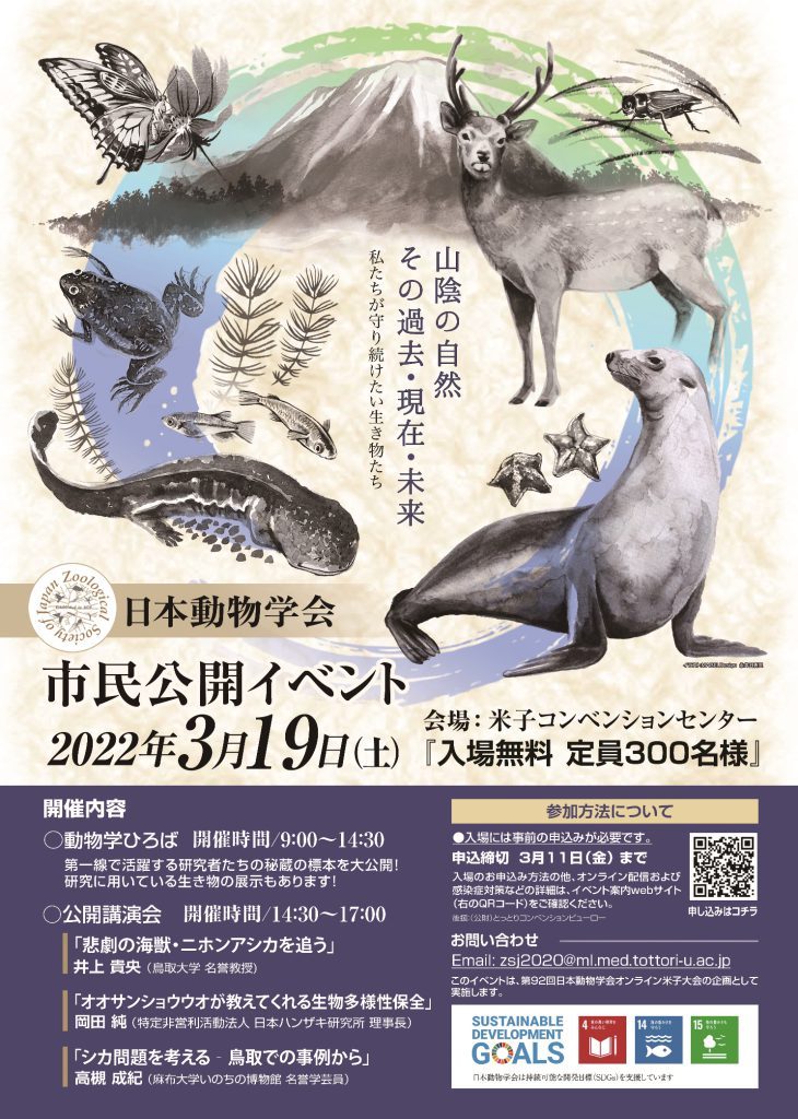 3月19日、第92回 日本動物学会 市民公開イベントで「ミクロの世界の写真展 ~サイエンスがアートに!~」を展示しました。「電子顕微鏡のまち・米子市」会員の作品や電子顕微鏡写真家 西永奨氏の作品などを展示。