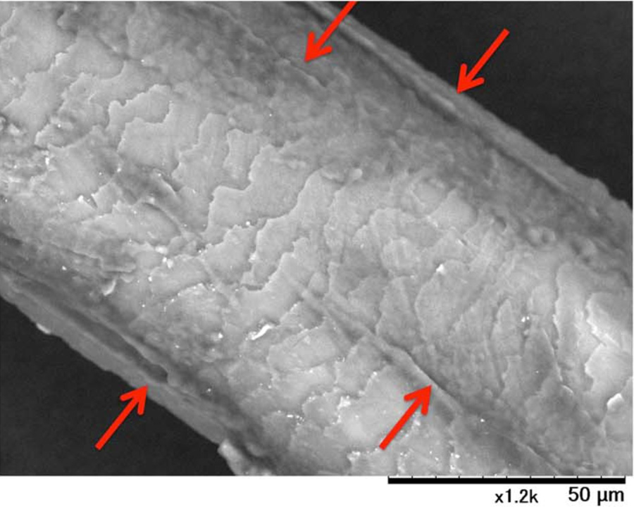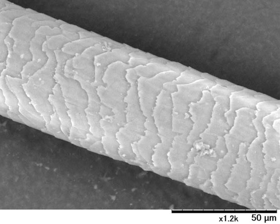 お猿のトン吉君と親方の五郎さんの髪の毛を提供していただき、電子顕微鏡で観察しました。