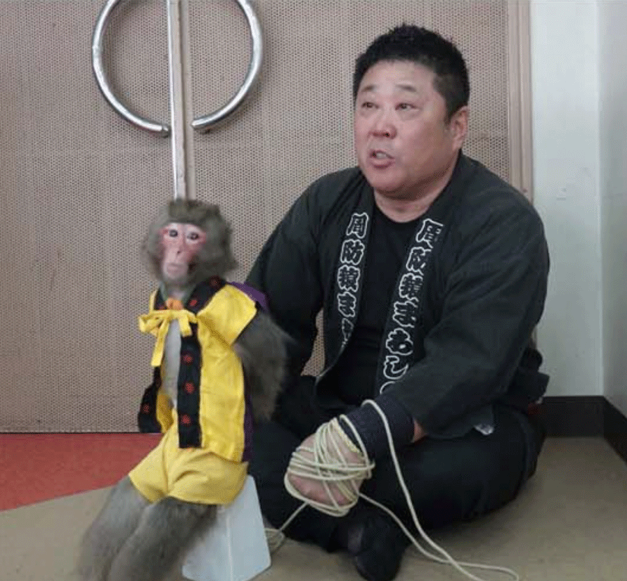 周防の猿まわしご一行さま(左:とん吉くん 右:村崎五郎さん)