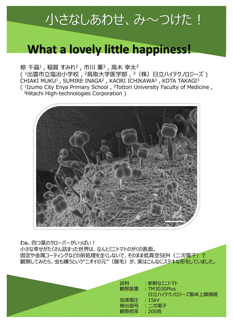 椋さん(出雲市立塩冶 小学校3年生)は、ミクロの世界探検コーナー開設1周年記念写真展 のギャラリートーク「トマトのにおいのひみつ トマトのにおいがするしくみをさぐる」で発表した小さな四葉のクローバーのような可愛い形の袋(腺毛)の写真(走査電子顕微鏡写真)を出品しました。
