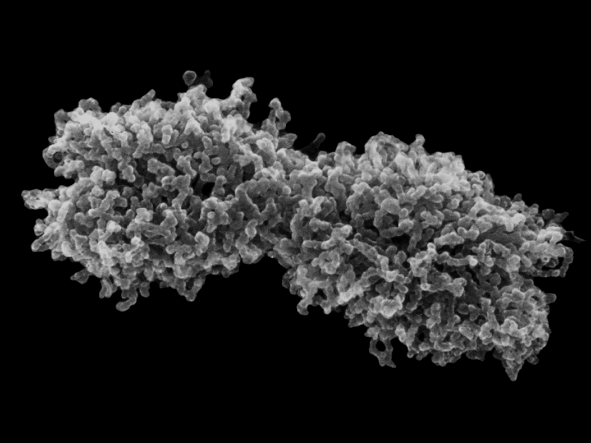 ヒトのリンパ球培養細胞から取り出した染色体の1本を走査電子顕微鏡で撮影。